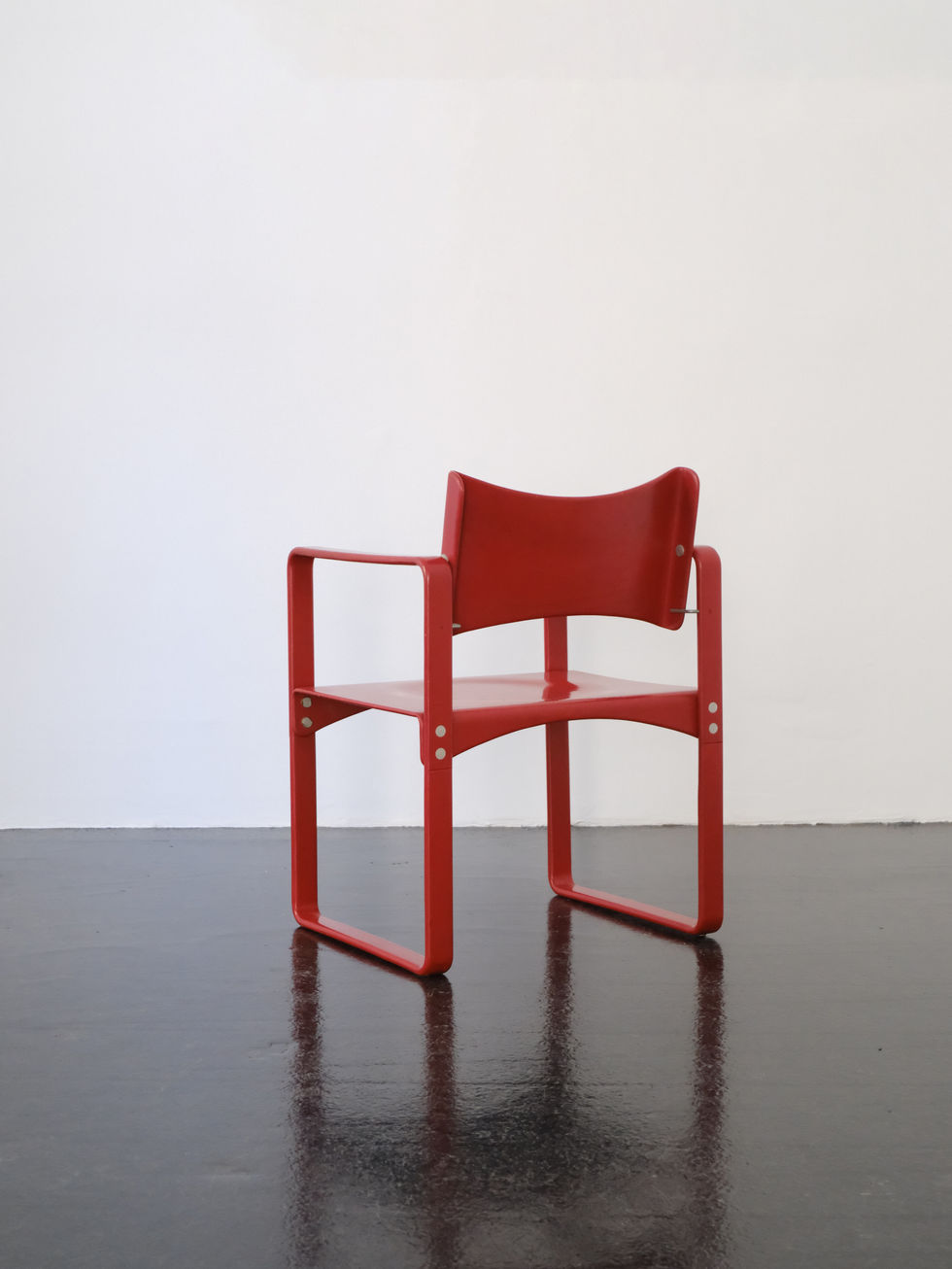 Designed by Verner Panton in the 1960s for Thonet, the "271F" chair is a striking example of mid-century modern woodcraft. Made of bent and laminated wood, its flowing, organic form curves to support the sitter comfortably. Shown here in bold red - a timeless design.