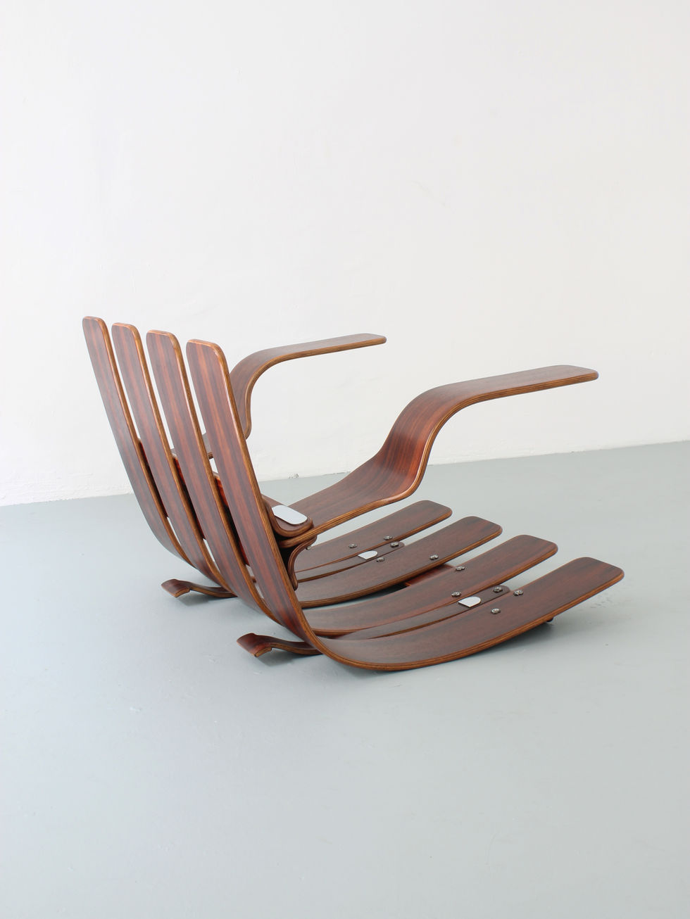 Beautiful rocking chair, possibly by Laauser/ Switzerland 1960s made out of Brazilian rosewood plywood. The thick cushions provide an excellent seating comfort and lie loose in the frame. Due to its design they can be easily removed.