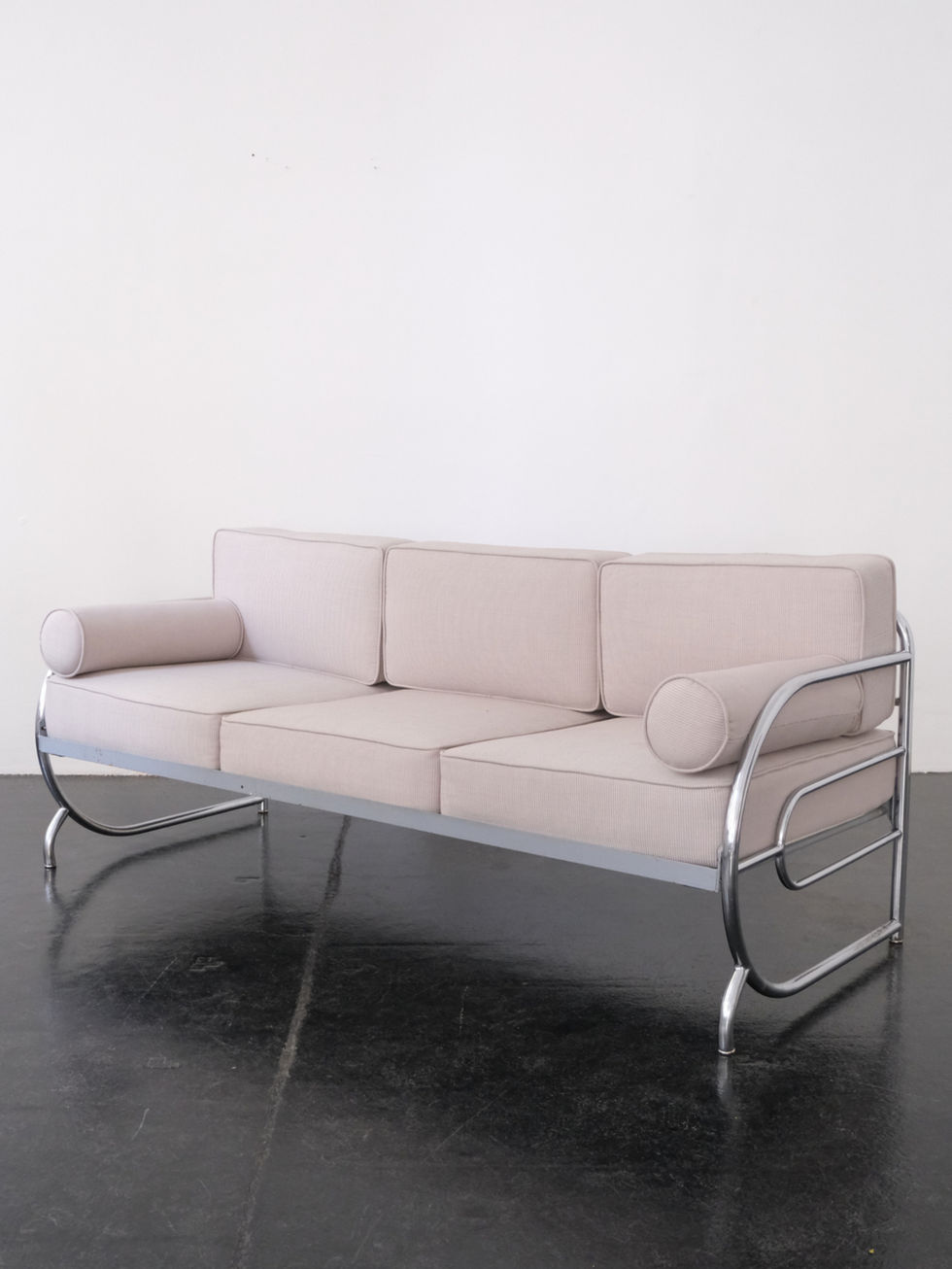 This sofa, inspired by 1930s Bauhaus design and attributed to Czech designer Robert Slezak, features a chrome-plated tubular steel frame and comes with six cushions for seating comfort plus two decorative cushions. Its design reflects the clean lines and geometric clarity of early modernism, combining industrial materials with refined proportions. The cushions are arranged to enhance comfort and maintain a balanced, cohesive appearance, exemplifying the functionalist principles of the era.