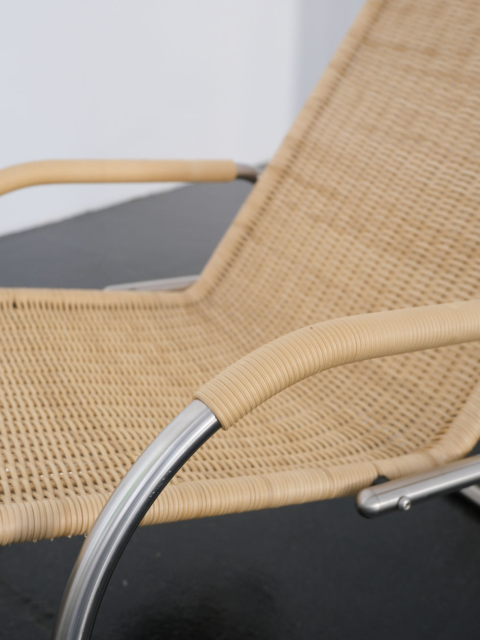 Designed by Ludwig Mies van der Rohe in 1931 and produced by Tecta, the F42-E1 chaise lounge features a stainless steel frame with a woven cane seat. Its clean lines and balanced proportions combine comfort with modernist clarity. Expert metalwork and weaving reflect high-quality craftsmanship.