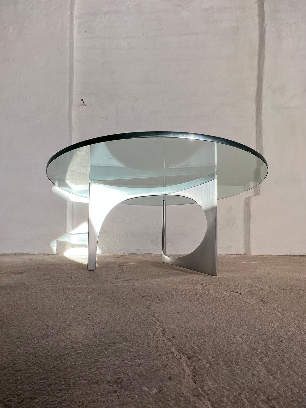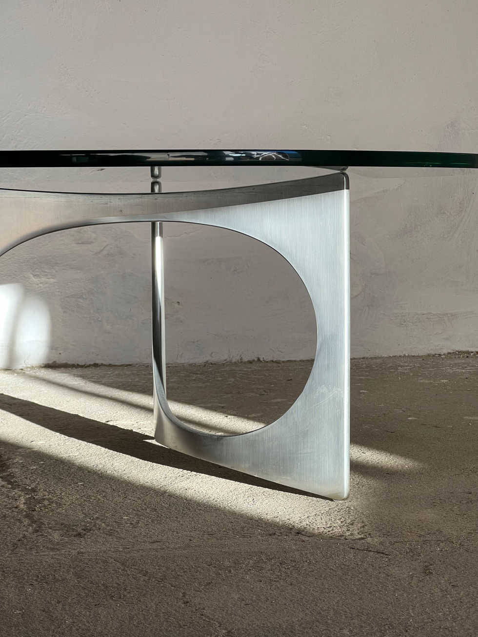 Sculptural coffee table from the 1960s, designed by Knut Hesterberg and manufactured by Ronald Schmitt in Germany. This table showcases an eye-catching combination of aluminum and glass.