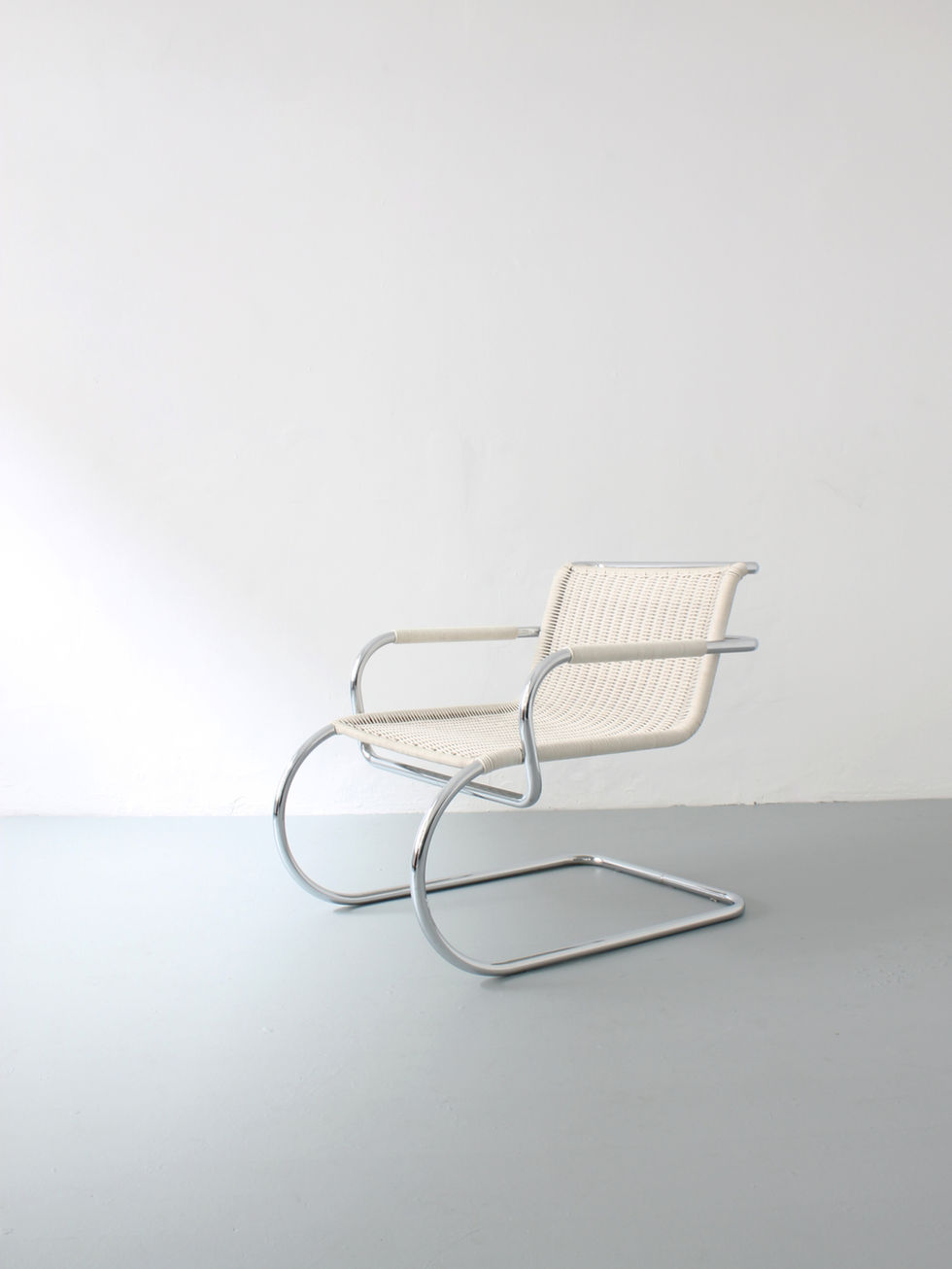 Franco Albini, one of the most important representatives of Italian Neo-Rationalism, designed this cantilever chair for the Venice Triennale in 1933 in collaboration with Renato Camus and Giancarlo Palanti. The chair is made of tubular stell and a rattan basket made of plastic.