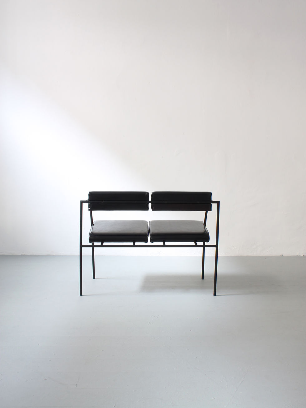 The "Vienna" two-seater, designed by Rodney Kinsman in the 1980s, embodies modernist style With a sleek, minimalist design. Manufactured by Bieffeplast in Italy, the bench features a sturdy metal frame and vinyl upholstery. Clean lines, making it an elegant & aesthetic piece of furniture.